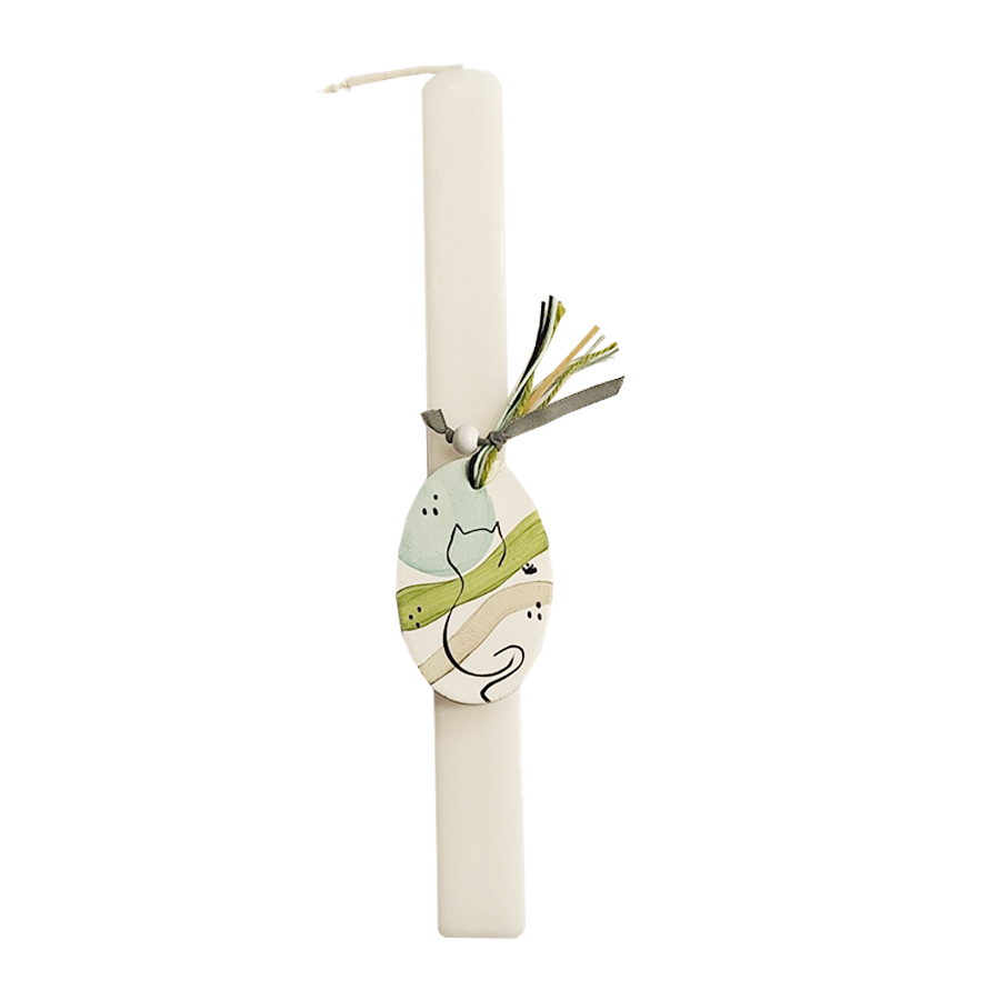 Ανακαλύψτε μια ξεχωριστή λευκή πλακέ λαμπάδα διακοσμημένη με κομψό κεραμικό στοιχείο σε οβάλ σχήμα με κορδόνια σε ταιριαστές αποχρώσεις του πράσινου και γαλάζιου, που απεικονίζει μια καλαίσθητη μορφή γάτας ζωγραφισμένη στο χέρι. Ο διαχρονικός συνδυασμός του λευκού χρώματος με τη λεπτομερή καλλιτεχνική απεικόνιση δημιουργεί ένα εκλεπτυσμένο αποτέλεσμα, ιδανικό για όσους αγαπούν το minimal ύφος. Ιδανική επιλογή για νονά και νονό που θέλουν να χαρίσουν ένα ξεχωριστό πασχαλινό δώρο ή για όσους αγαπούν την κομψότητα του χειροποίητου και τις γάτες.