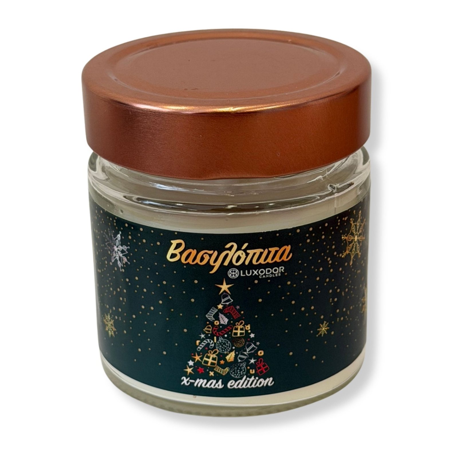 Το Αρωματικό Κερί Βασιλόπιτα είναι εμπνευσμένο από τη γλυκιά μυρωδιά του παραδοσιακού μας πρωτοχρονιάτικου γλυκού, για εσάς και τους αγαπημένους σας. Η γυάλινη κομψή συσκευασία του αποπνέει τη γιορτινή θαλπωρή. Ιδανικό για δώρο σε όσους αναζητούν ποιότητα και ευεξία ή για διακοσμητικό για το σπίτι σας.