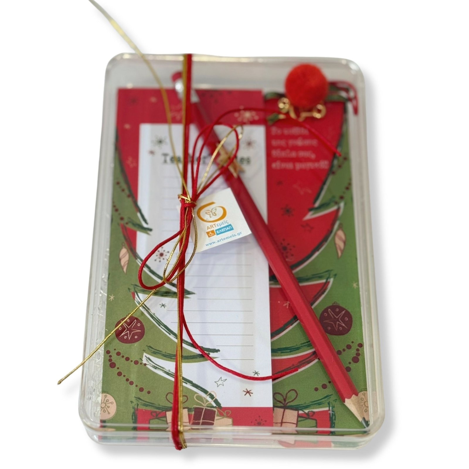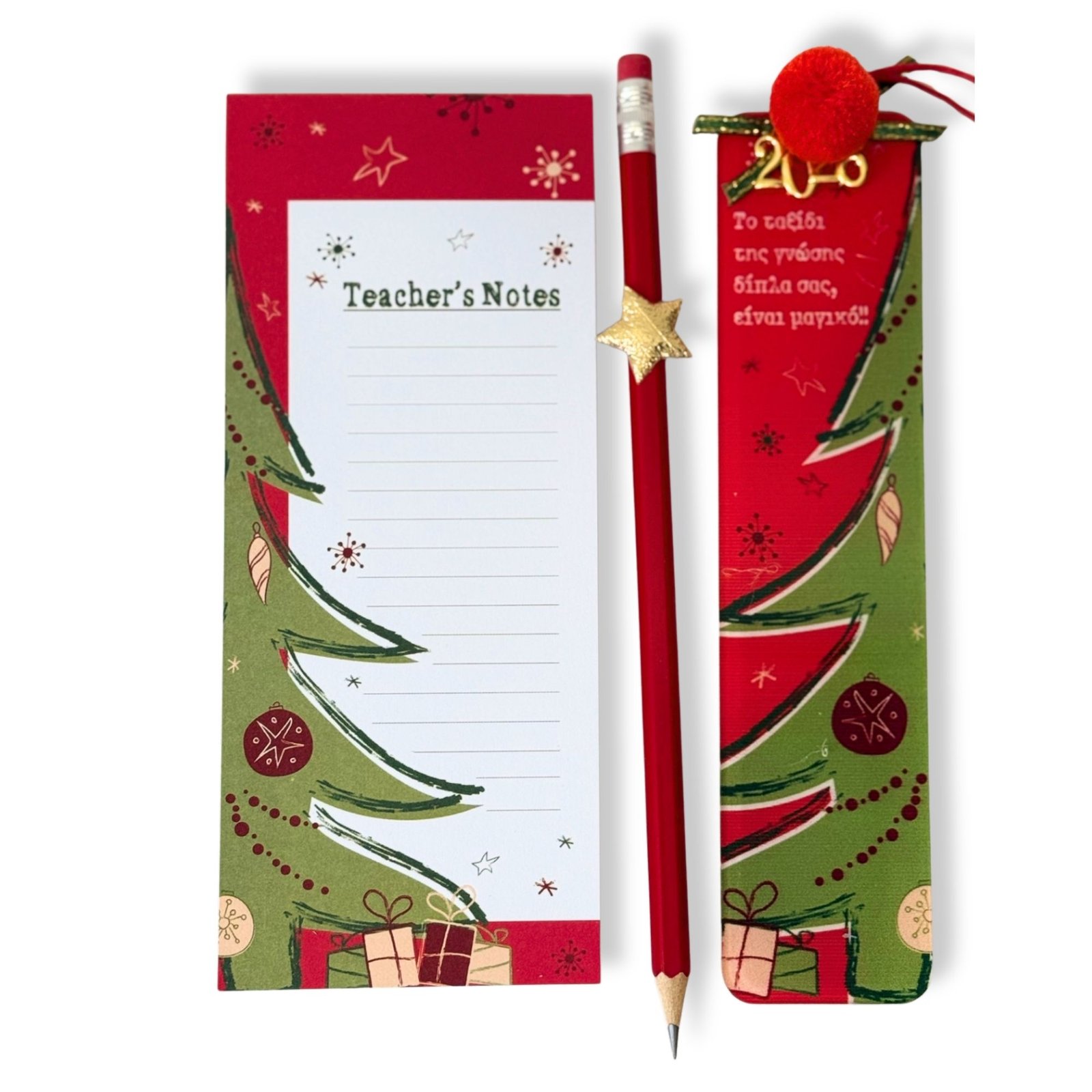 Χαρίστε τη μαγεία των Χριστουγέννων στους αγαπημένους δασκάλους με αυτό το κομψό σετ σημειώσεων. Ιδανικό, μικρό, προσεγμένο δώρο κατάλληλο για το γραφείο τους. Το σετ περιλαμβάνει μπλοκ σημειώσεων με γιορτινό σχέδιο και κόκκινο μολύβι, τυλιγμένα με διακοσμητική κορδέλα και στολίδι.