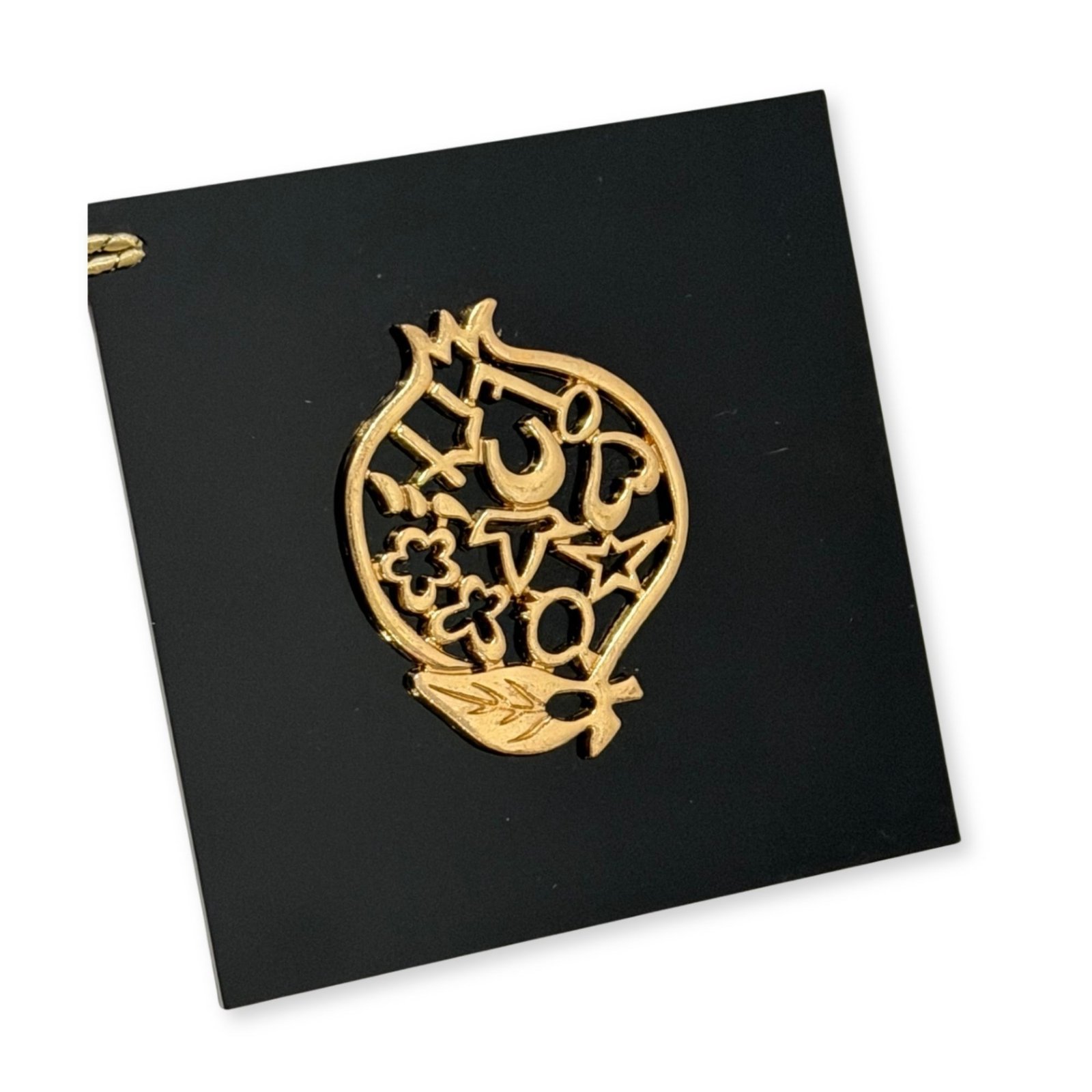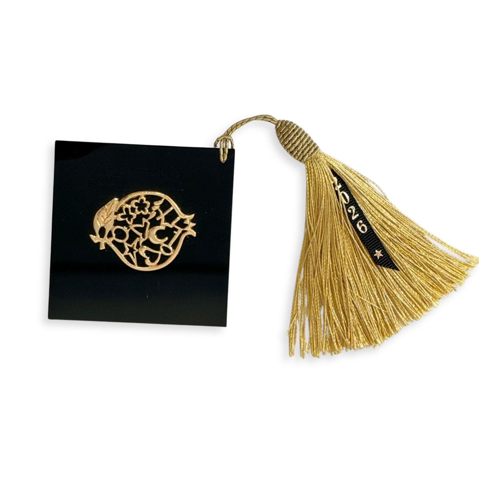 Επιτραπέζιο διακοσμητικό plexiglass με μεταλλικό στοιχείο ρόδι σε χρυσό χρώμα  και χρυσή φούντα, ιδανικό για το σπίτι ή το γραφείο. Προσφέρει κομψότητα και θετική ενέργεια στον χώρο. Χειροποίητο γούρι τέλειο δώρο για  τις γιορτές.