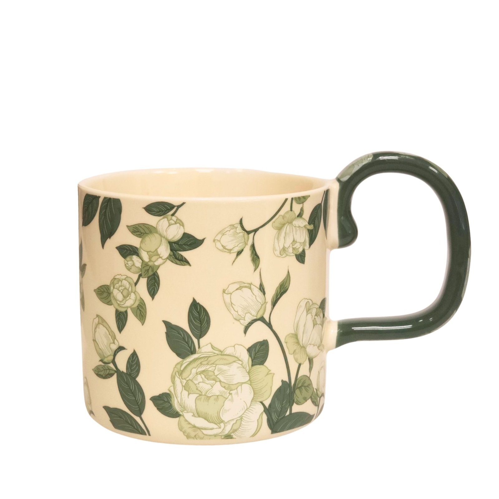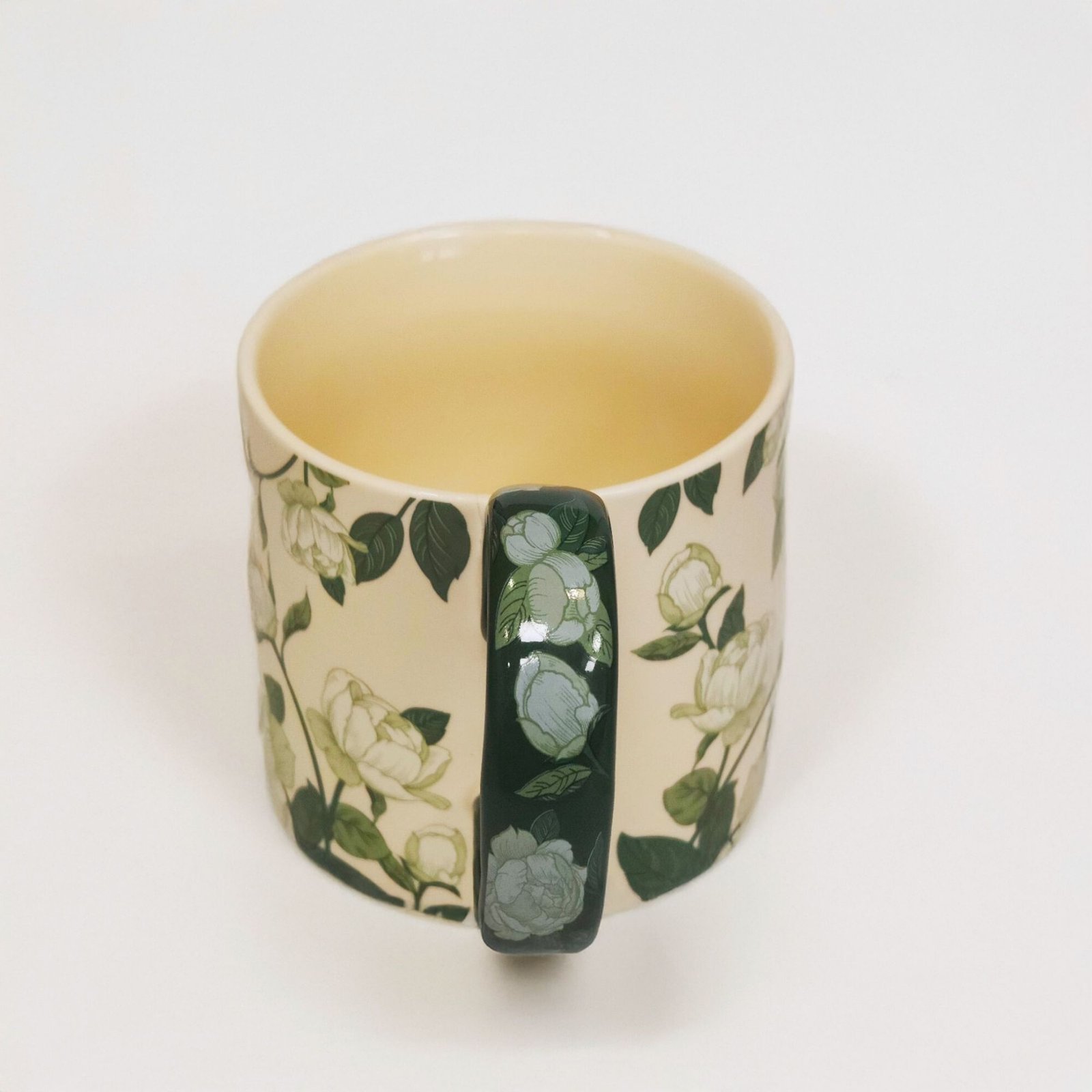 Το χερούλι είναι το πιο ιδιαίτερο στοιχείο της κούπας. Έχει γλυπτική φόρμα και βαθύ πράσινο χρώμα, λειτουργώντας σαν ένα σταθερό πλαίσιο που αγκαλιάζει το σώμα της κούπας και ολοκληρώνει αρμονικά το σχέδιο.