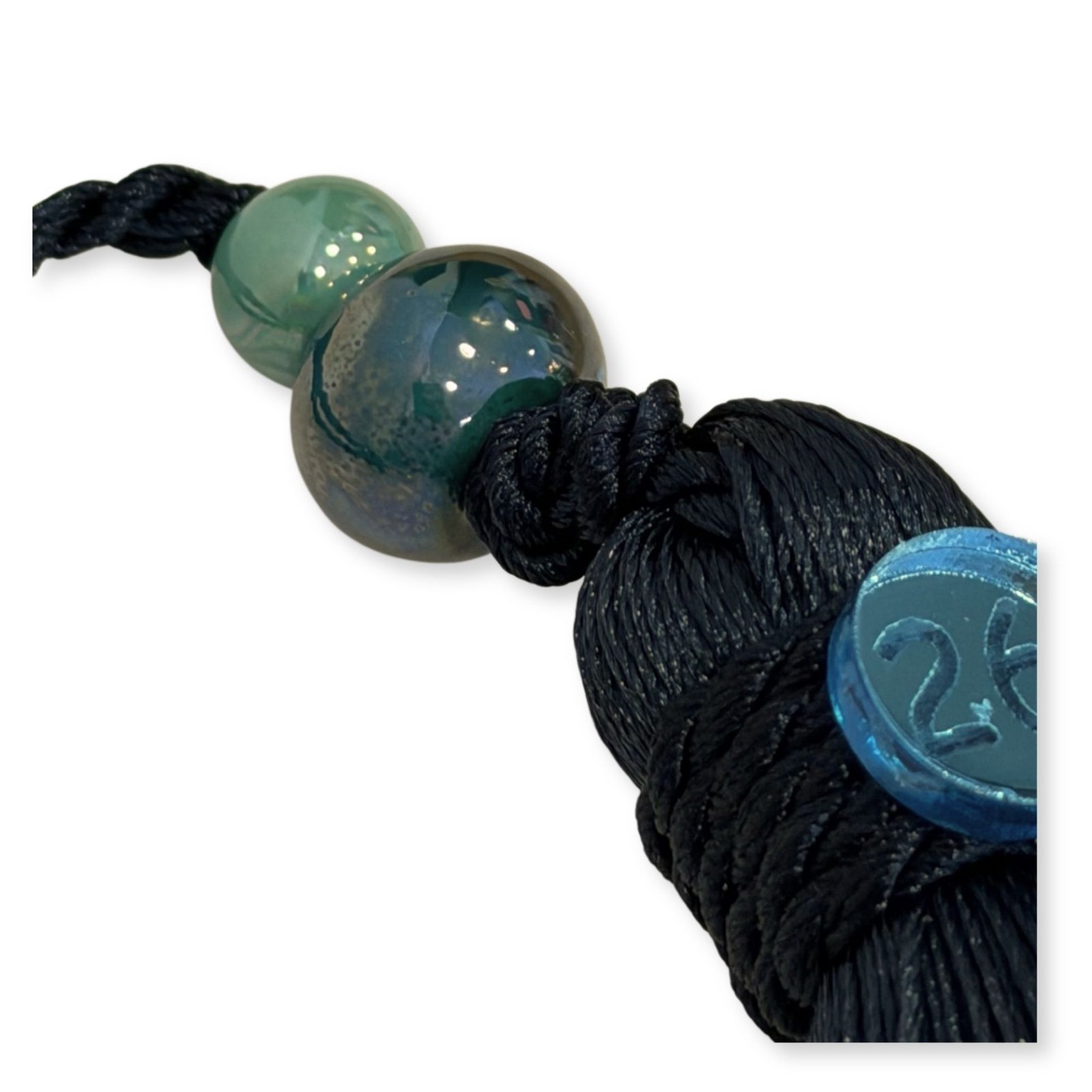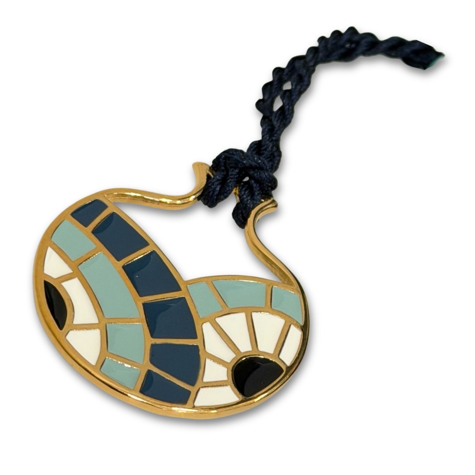 Κομψό χειροποίητο γούρι διακοσμημένο με μπλε φούντα, μπλε χάντρα και χρυσό στρογγυλό στοιχείο με μωσαϊκό σχέδιο σε γαλάζιους τόνους. Ένα ιδιαίτερο κομμάτι που συνδυάζει το μοντέρνο στυλ και τον παραδοσιακό συμβολισμό τύχης. Ιδανικό για δώρο ή για διακόσμηση σπιτιού και γραφείου.