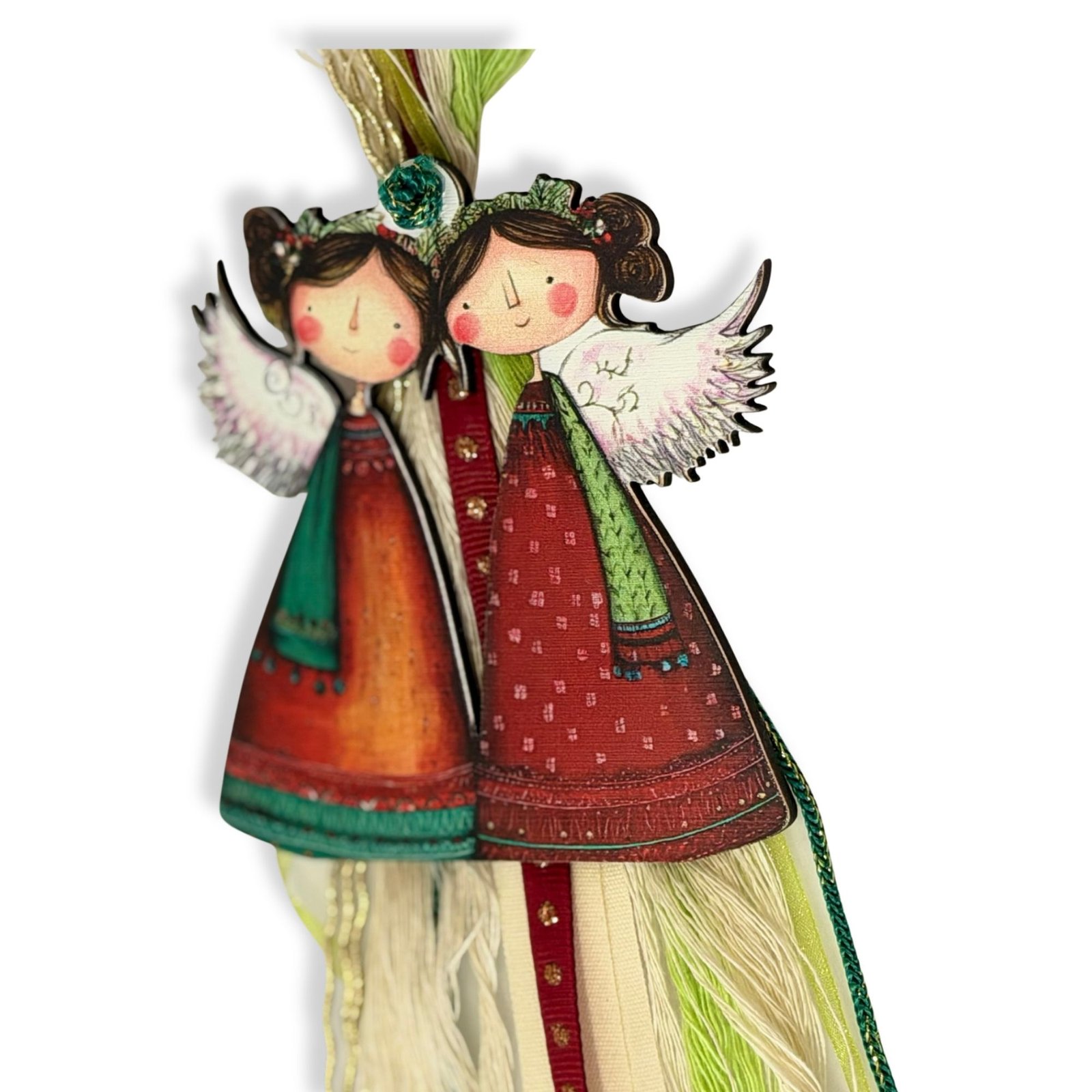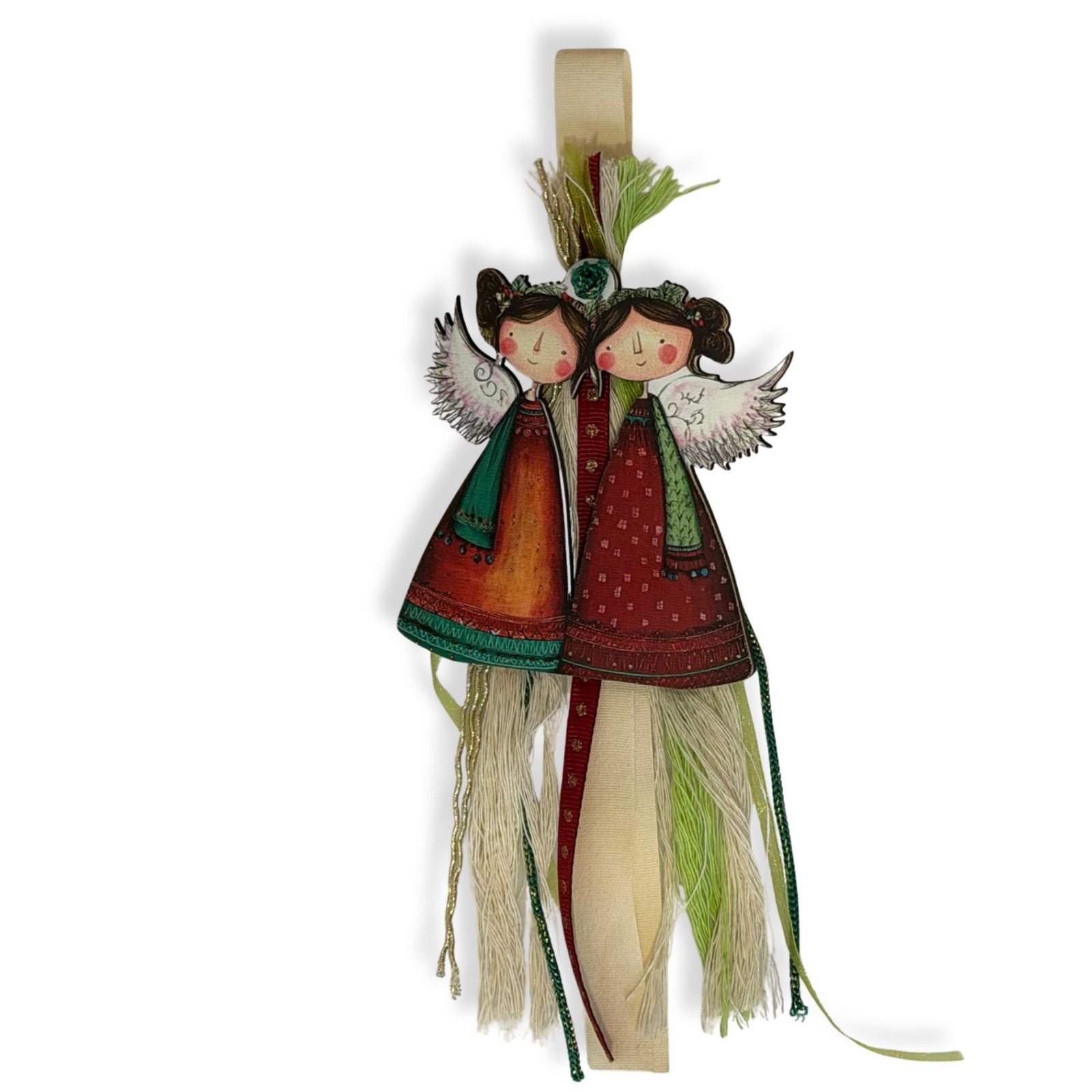 Aυτό το ιδιαίτερο ξύλινο στολίδι, με τους δίδυμους αγγέλους, είναι κατασκευασμένο με προσοχή στη λεπτομέρεια και ζωντανές αποχρώσεις, αποτελεί ιδανική επιλογή για δώρο ή για να στολίσετε το δέντρο σας. Η φούντα προσθέτει μια κομψή, χειροποίητη πινελιά, κάνοντάς το κομμάτι μοναδικό και ξεχωριστό.