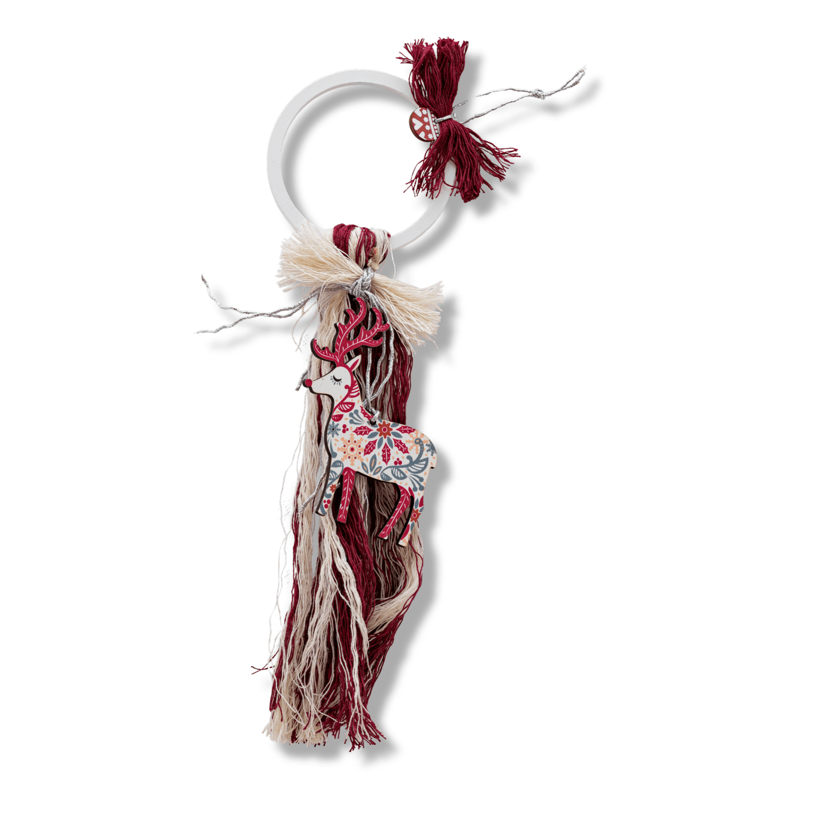 Xειροποίητο διακοσμητικό κρεμαστό με δαχτυλίδι, ελαφάκι  και φούντα, και σε αποχρώσεις μπορντό και εκρού. Διακοσμημένο με κορδέλες και νήματα διαφορετικών υφών, προσφέρει ένα ζεστό, boho ύφος σε κάθε χώρο. Ιδανικό για πόρτες, τοίχους ή ως διακοσμητικό για δώρo.