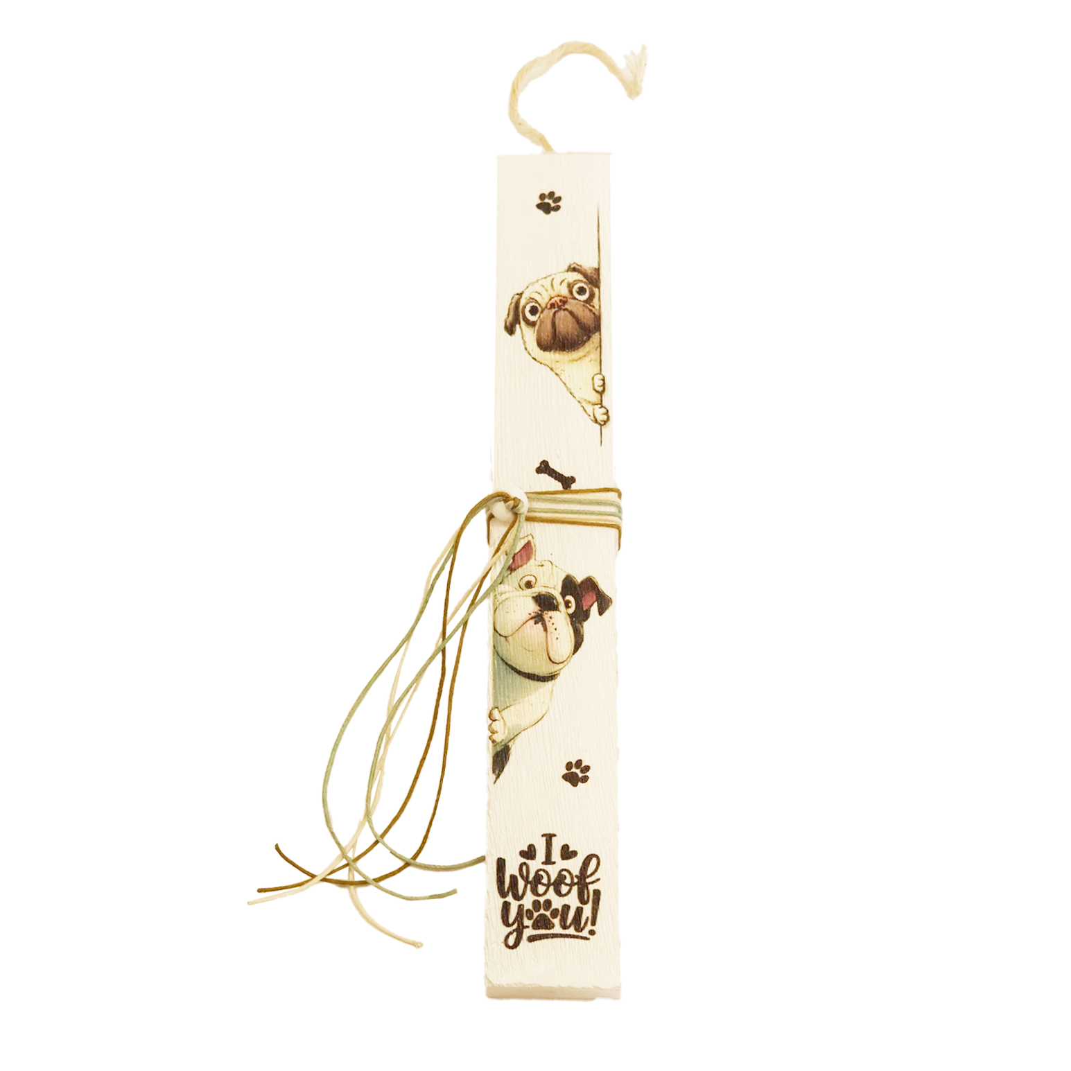 Η πασχαλινή λαμπάδα «I Woof You - Bulldog» είναι η ιδανική επιλογή για όσους αγαπούν τους σκύλους bulldog! Πατούσες κόκκαλο και το μήνυμα "I woof you"μπλέκονται με τις χαριτωμένες πόζες τους. Ξεχωριστή πινελιά οι ταιριαστές κορδέλες .Με πλακέ σχήμα και διακριτικό άρωμα, προσφέρει μια αισθητική που ξεχωρίζει. Οι σκύλοι δημιουργούν μια εντυπωσιακή πρόταση για το Πάσχα. Ιδανική για δώρο σε αυτούς που αγαπούν τα πιστά αυτά ζωάκια ή για εσάς που αναζητάτε μια διαφορετική λαμπάδα.