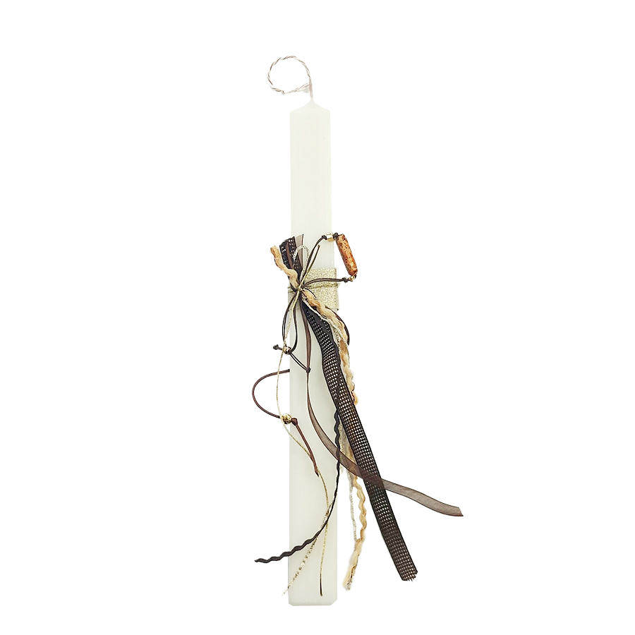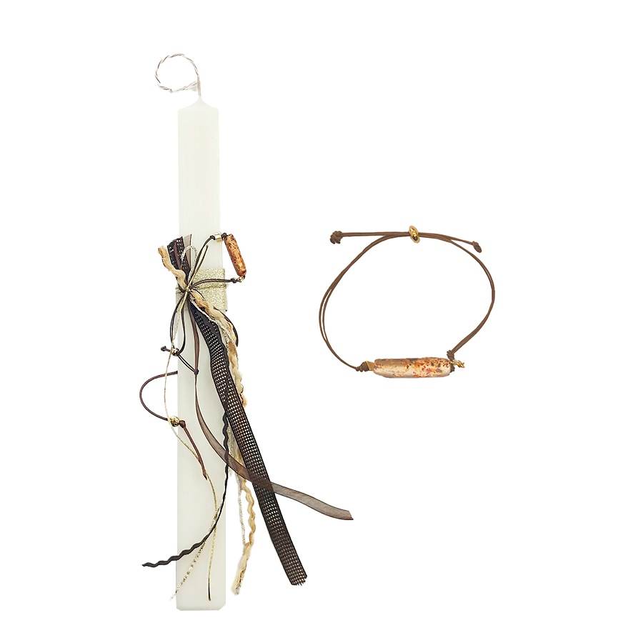 Χειροποίητη πασχαλινή λαμπάδα με κομψό κόσμημα–βραχιόλι σε γήινες αποχρώσεις, διακοσμημένη με ταιριαστές καφέ και χρυσές κορδέλες που χαρίζουν ζεστασιά και κομψότητα. Το βραχιόλι διαθέτει μεταλλικό bead stopper που συγκρατεί τα στοιχεία με ασφάλεια, ενώ παράλληλα προσθέτει μία διακριτική μεταλλική λάμψη. Στο κέντρο ξεχωρίζει μια κεραμική σομόν πέτρα σε κυλινδρικό σχήμα, η οποία δίνει φυσικό χαρακτήρα στο κόσμημα. Το σχέδιο ολοκληρώνεται με ένα μίνι τετράγωνο χρυσό στοιχείο που προσθέτει κομψότητα και μοντέρνα αισθητική. Ένα ιδιαίτερο δώρο που συνδυάζει την αισθητική της λαμπάδας με ένα διαχρονικό αξεσουάρ.