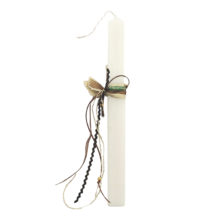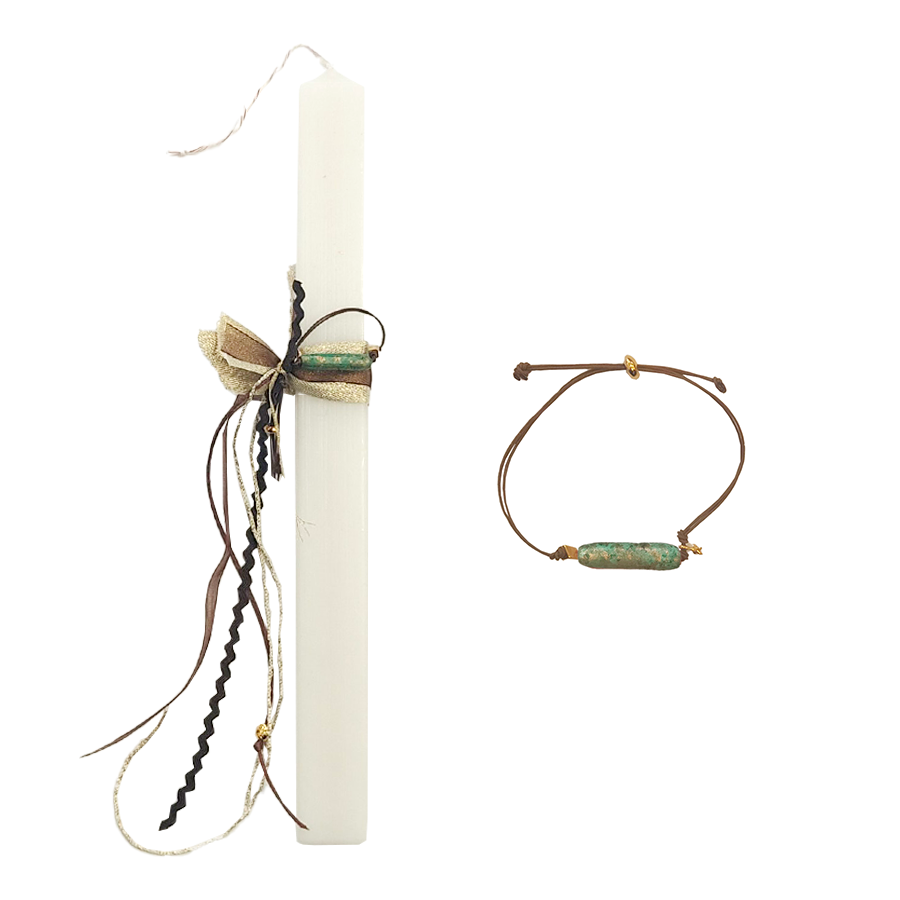 Χειροποίητη πασχαλινή λαμπάδα με κομψό κόσμημα–βραχιόλι σε γήινες αποχρώσεις, διακοσμημένη με ταιριαστές καφέ και χρυσές κορδέλες που χαρίζουν ζεστασιά και κομψότητα. Το βραχιόλι διαθέτει μεταλλικό bead stopper που συγκρατεί τα στοιχεία με ασφάλεια, ενώ παράλληλα προσθέτει μία διακριτική μεταλλική λάμψη. Στο κέντρο ξεχωρίζει μια κεραμική πέτρα σε κυλινδρικό σχήμα σε όμορφη πράσινη απόχρωση, η οποία δίνει φυσικό χαρακτήρα στο κόσμημα. Το σχέδιο ολοκληρώνεται με ένα μίνι τετράγωνο χρυσό στοιχείο που προσθέτει κομψότητα και μοντέρνα αισθητική. Ένα ιδιαίτερο δώρο που συνδυάζει την αισθητική της λαμπάδας με ένα διαχρονικό αξεσουάρ.