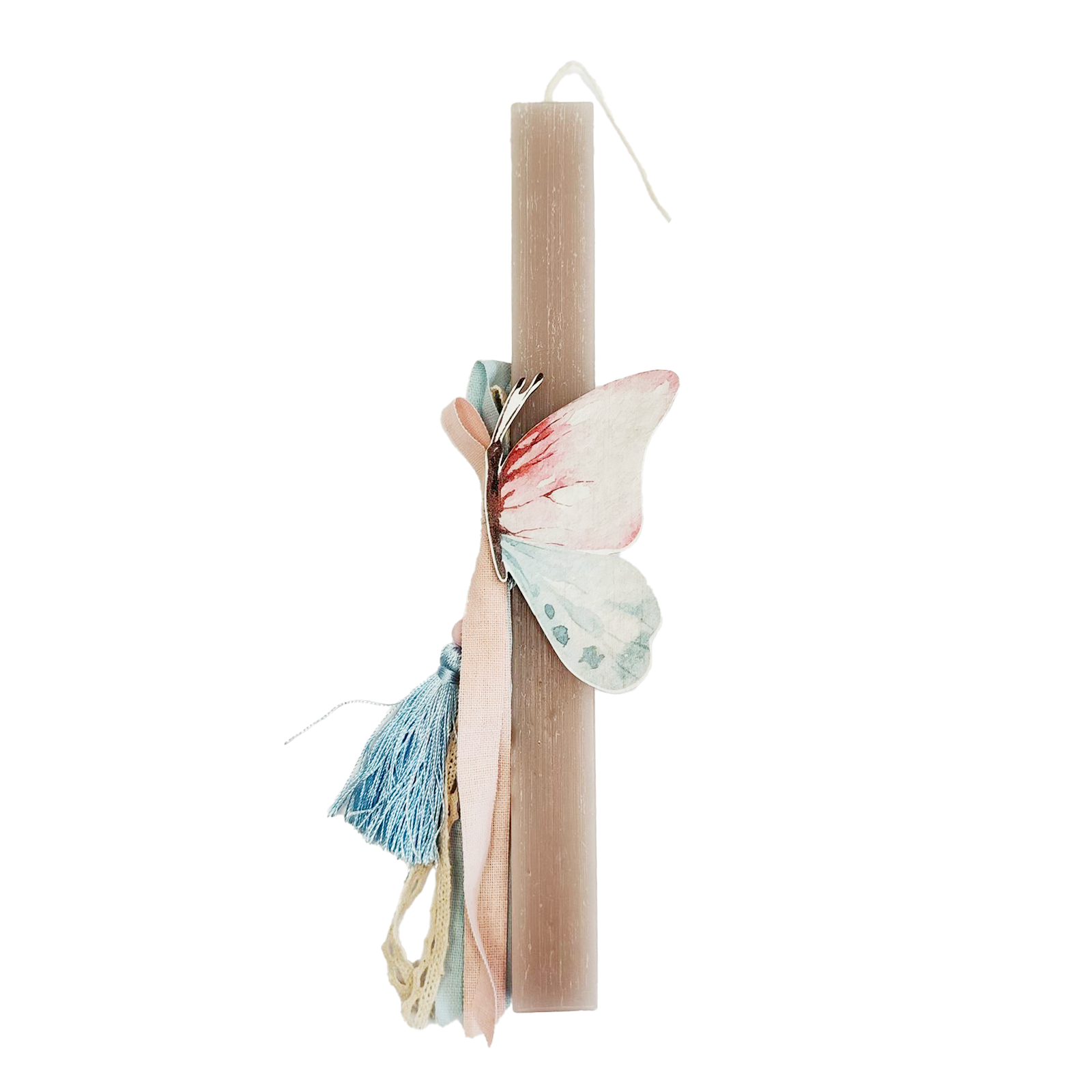 Πασχαλινή λαμπάδα σε κομψή μπεζ απόχρωση, διακοσμημένη με εντυπωσιακή διακοσμητική πεταλούδα σε παστέλ αποχρώσεις. Η σύνθεση ολοκληρώνεται με υφασμάτινες κορδέλες και διακοσμητική φούντα σε απαλό γαλάζιο χρώμα, δημιουργώντας ένα ρομαντικό και καλαίσθητο αποτέλεσμα. Ο συνδυασμός των φυσικών χρωμάτων και των υφασμάτινων στοιχείων προσφέρει μια κομψή και μοντέρνα αισθητική που ξεχωρίζει.ιδανική επιλογή για νονό ή νονά που θέλουν να προσφέρουν ένα όμορφο και ιδιαίτερο πασχαλινό δώρο για τη βραδιά της Ανάστασης.