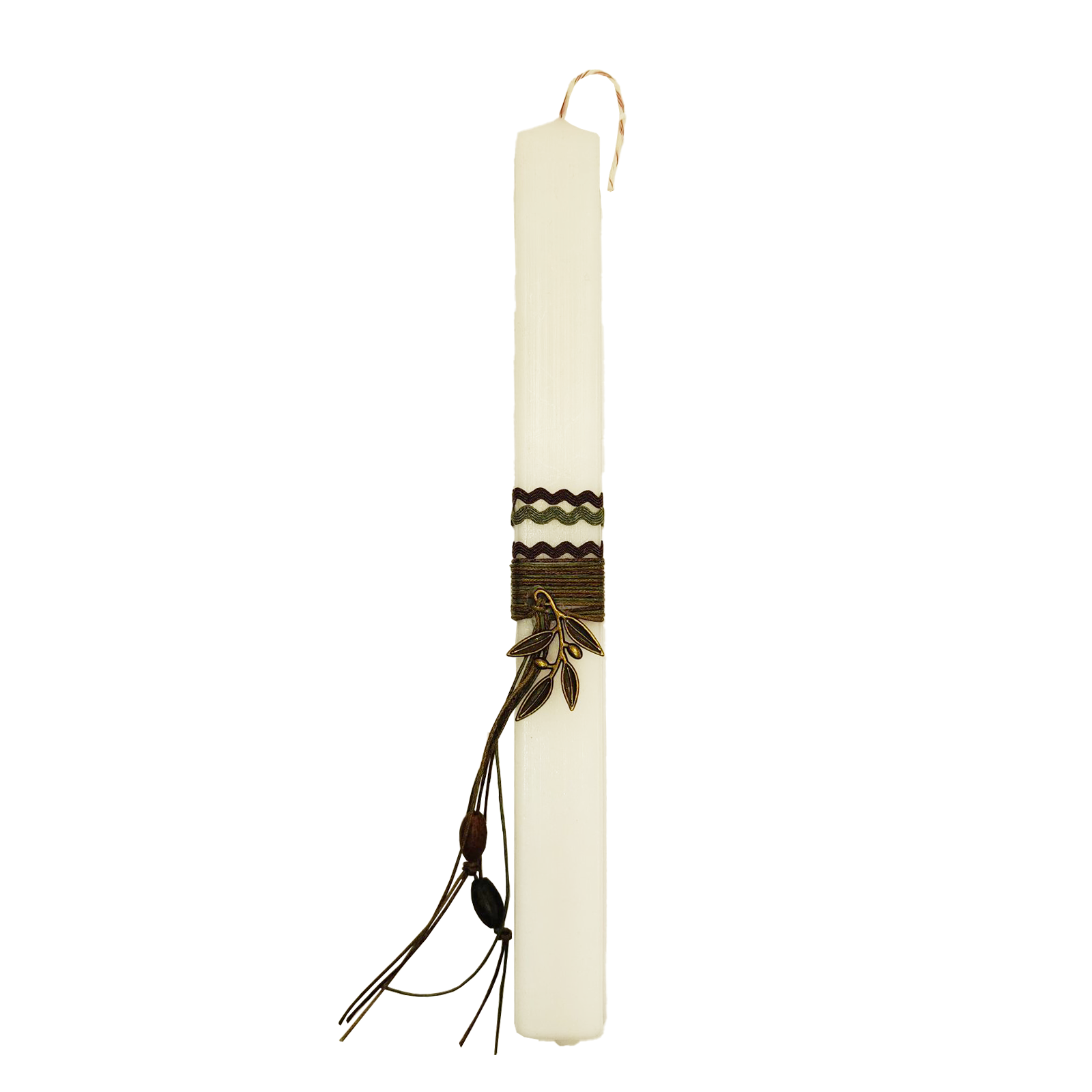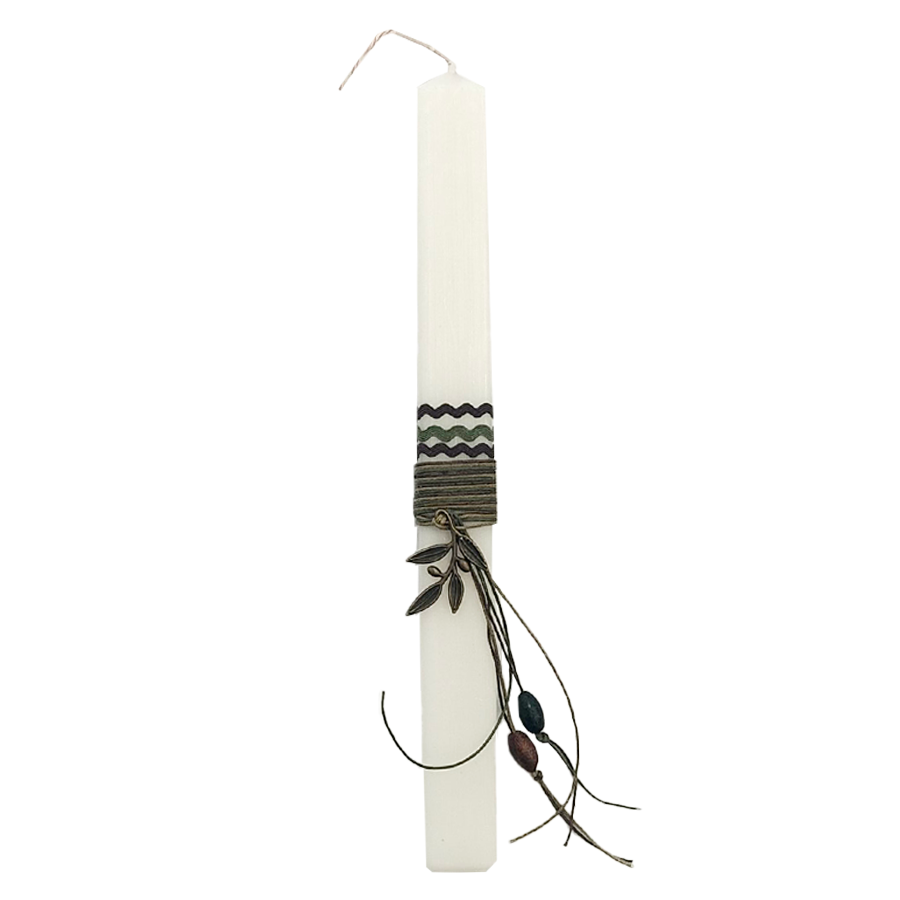 Λευκή πλακέ πασχαλινή λαμπάδα με κομψό διακοσμητικό καρπό ελιάς, που αποπνέει διακριτική πολυτέλεια και συμβολισμό. Η λαμπάδα είναι στολισμένη με όμορφες κορδέλες σε ταιριαστές αποχρώσεις, δημιουργώντας ένα αρμονικό και καλαίσθητο αποτέλεσμα που ξεχωρίζει, την καθιστά ιδανική επιλογή για νονό ή νονά που αναζητούν ένα ιδιαίτερο και διαχρονικό πασχαλινό δώρο. Ο λιτός αλλά εντυπωσιακός σχεδιασμός της ταιριάζει τόσο σε εφήβους όσο και σε ενήλικες.