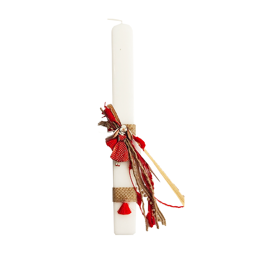 Ανακαλύψτε μια ξεχωριστή πασχαλινή λαμπάδα που συνδυάζει απλότητα και γλυκιά αισθητική! Η λευκή, πλακέ λαμπάδα είναι διακοσμημένη με ξύλινο  λαγουδάκι με κόκκινο φόρεμα και πολύχρωμες κορδέλες, δημιουργώντας ένα τρυφερό και παιχνιδιάρικο αποτέλεσμα. Ιδανική επιλογή για νονά  ή νονό που θέλει να προσφέρει ένα ιδιαίτερο και προσεγμένο δώρο στο βαφτιστήρι του ή για αγαπημένα πρόσωπα.