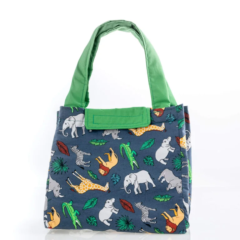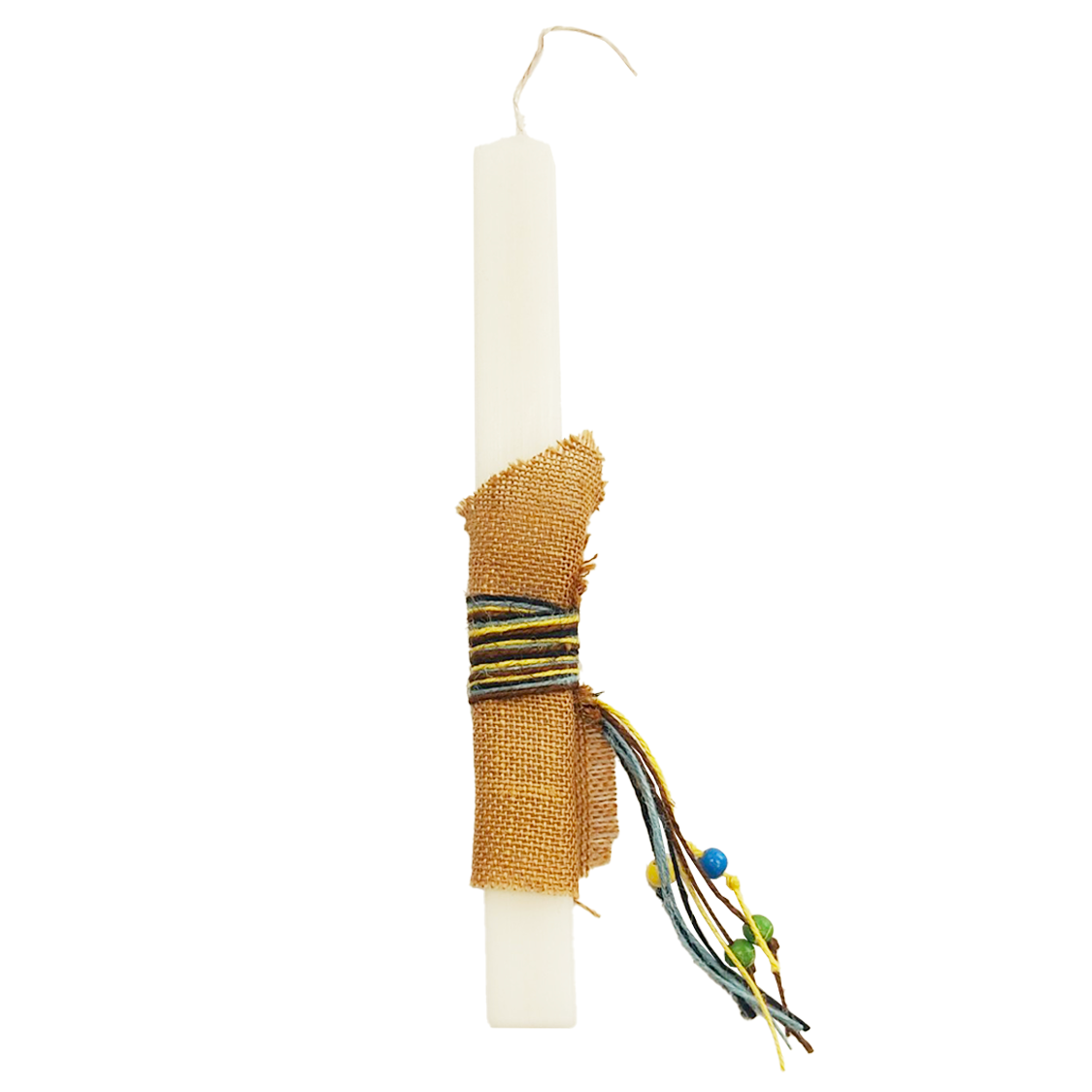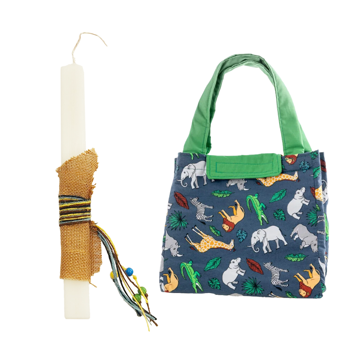 Ξεχωριστό πασχαλινό σετ λαμπάδας με παιδικό lunch bag, ιδανικό για δώρο σε παιδιά. Η λευκή πλακέ λαμπάδα είναι διακοσμημένη με φυσικό ύφασμα τύπου λινάτσας, πολύχρωμα κορδόνια και διακριτικές χάντρες, δημιουργώντας ένα όμορφο και παιχνιδιάρικο αποτέλεσμα.Το σετ συνοδεύεται από ένα πρακτικό παιδικό lunch bag με θέμα τη ζούγκλα, διακοσμημένο με χαρούμενα ζωάκια όπως ελέφαντες, καμηλοπαρδάλεις, ζέβρες και ρινόκερους. Διαθέτει πράσινα χερούλια και ιδανικό μέγεθος για τη μεταφορά σνακ, φαγητού ή μικρών αντικειμένων για το σχολείο, τη βόλτα ή τις δραστηριότητες των παιδιών.Αποτελεί μια όμορφη και χρηστική επιλογή για πασχαλινό δώρο σε βαφτιστήρια, συνδυάζοντας την παράδοση της λαμπάδας με ένα καθημερινό αξεσουάρ που τα παιδιά θα χρησιμοποιούν όλο τον χρόνο.