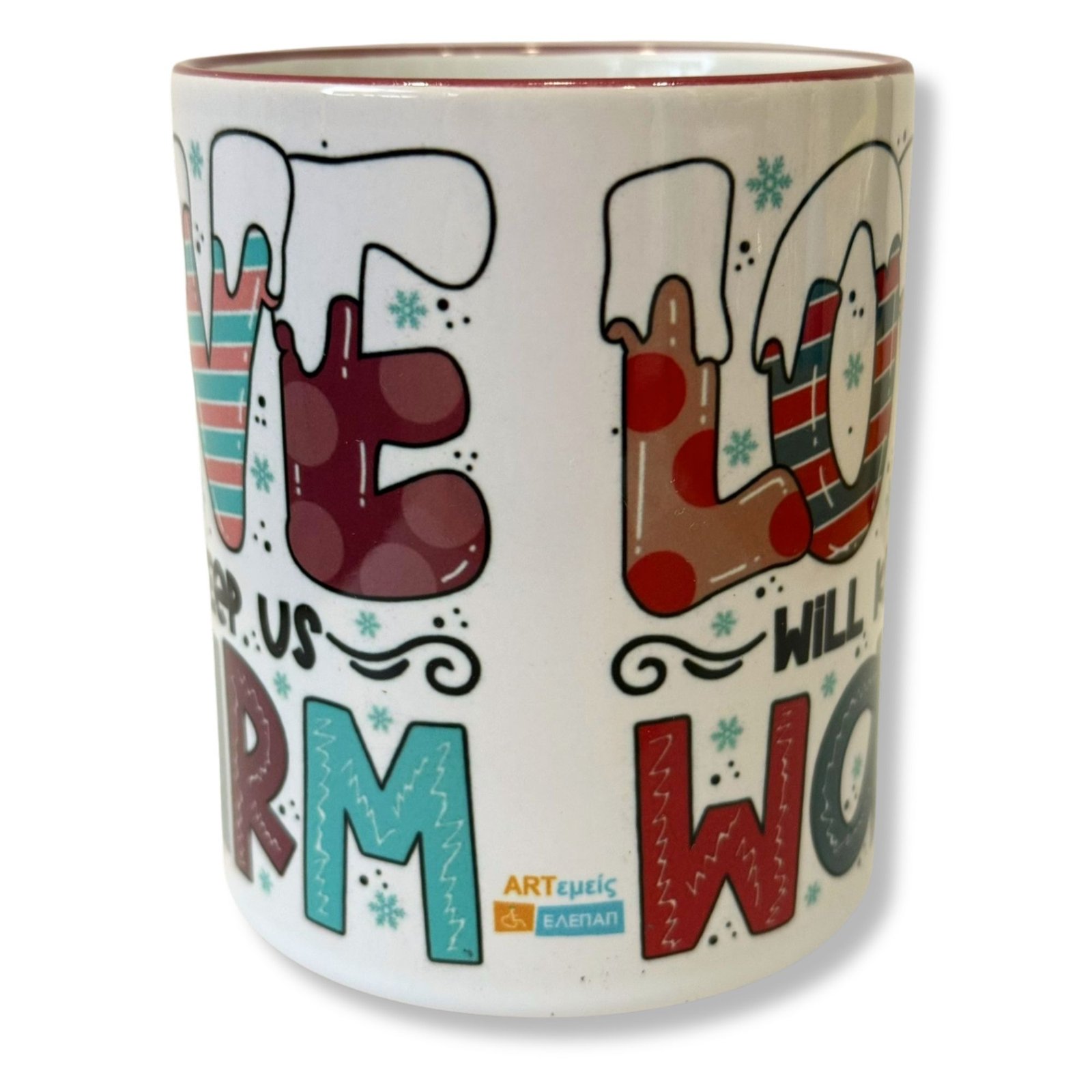 Πορσελάνινη κούπα με λευκό σώμα και σκούρο μπορντό χερούλι και περίγραμμα στο χείλος. Στην επιφάνεια της κούπας υπάρχει πολύχρωμη στάμπα με τη φράση: Love Will Keep Us Warm χαρίζοντάς μας ρομαντική διάθεση. Ιδανική για τον πρωινό καφέ ή το τσάι σας, προσθέτοντας στυλ και θετική διάθεση στην καθημερινότητά σας.
