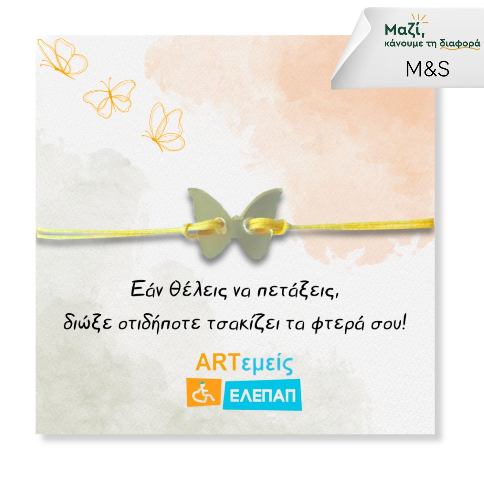 Αυτό το βραχιόλι δημιουργήθηκε μέσα από ένα εθελοντικό εργαστήριο, όπου οι εργαζόμενοι της M&S συμμετείχαν ενεργά στη διαδικασία κατασκευής του. Με την πολύτιμη υποστήριξη της M&S, που χρηματοδότησε τα υλικά, οι πεταλούδες ανοίγουν τα φτερά τους για να στολίσουν κάθε καρπό. Ανακαλύψτε τα με ειδική σήμανση στο www.artemeis.gr.