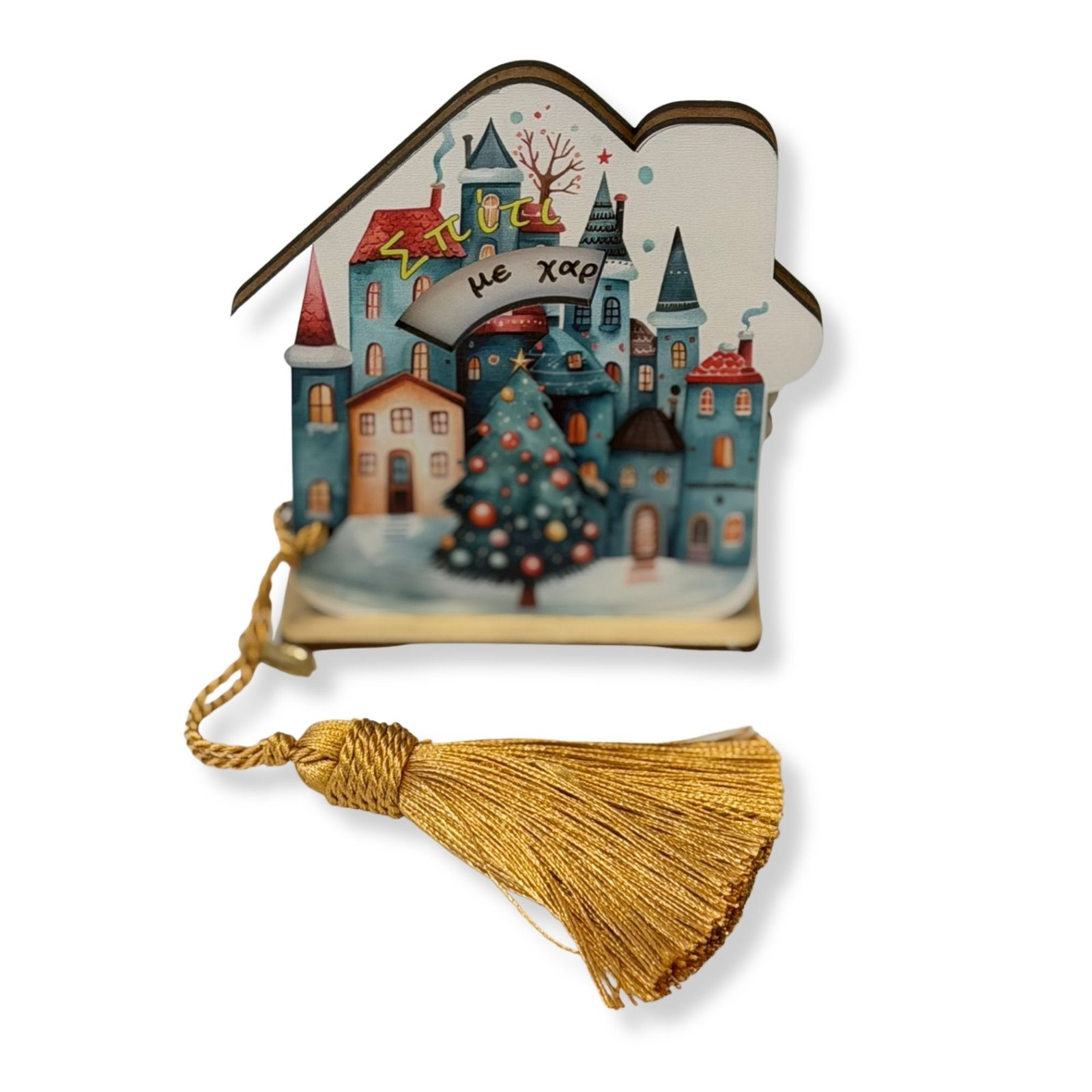 Ξύλινο Επιτραπέζιο Σπιτάκι Ροδέλα Ευχές Chistmas Town