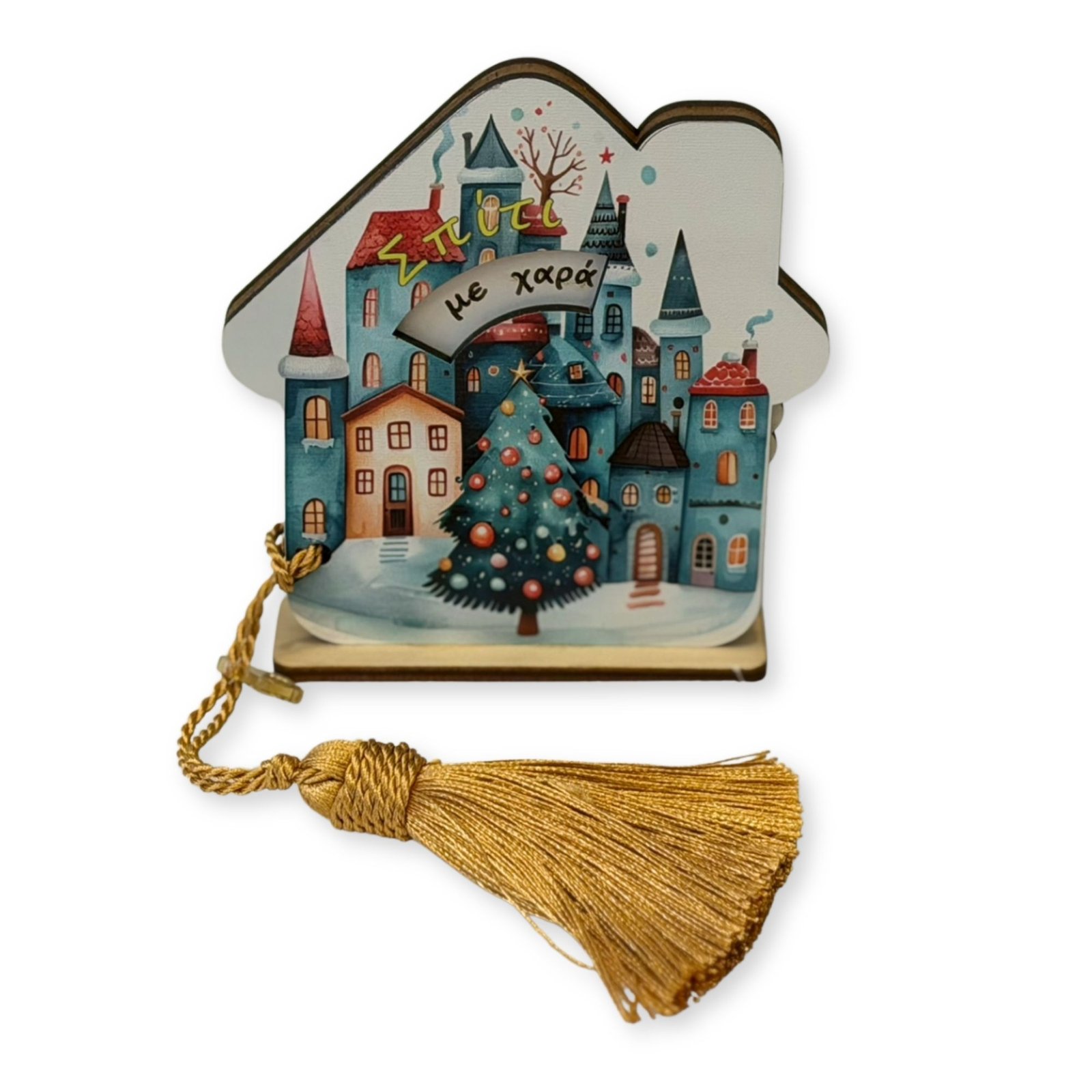 Aυτό το ιδιαίτερο ξύλινο διακοσμητικό σουβενίρ, απεικονίζει μια χριστουγεννιάτικη πόλη. Κατασκευασμένο με προσοχή στη λεπτομέρεια και ροδέλα που αποκαλύπτει, γυρίζοντας , ευχές, αποτελεί ιδανική επιλογή για δώρο ή για να δώσετε μια κομψή νότα σε ράφι, γραφείο ή βιτρίνα. Η φούντα προσθέτει μια κομψή, χειροποίητη πινελιά, κάνοντάς το κομμάτι μοναδικό και ξεχωριστό. Ελαφρύ, πρακτικό και αισθητικά ευχάριστο, ταιριάζει σε κάθε διακόσμηση.